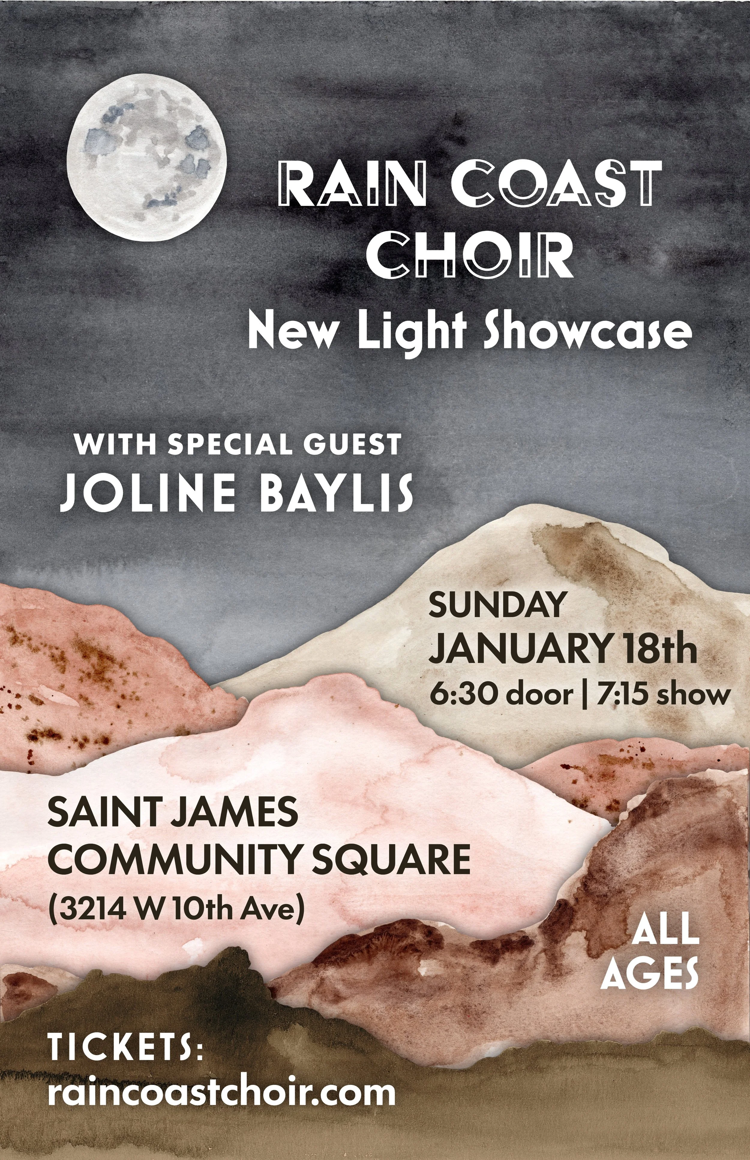 Rain Coast Choir is proud to present our New Light Showcase at St. James Community Square on Sunday, January 18th. We’ll sing original arrangements of songs by The Staves, The Cranberries, Billy Joel and more!