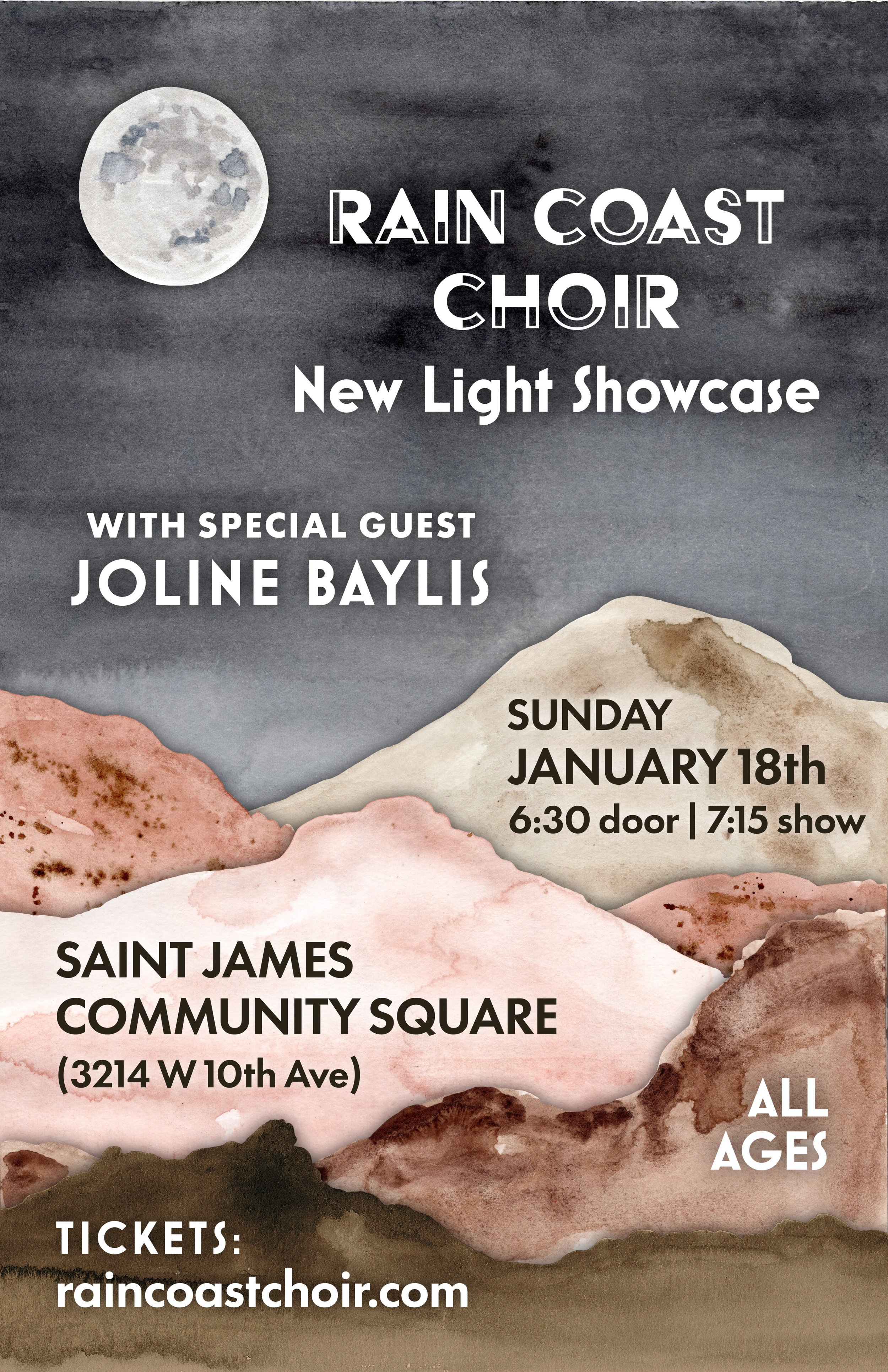 Rain Coast Choir is proud to present our New Light Showcase at St. James Community Square on Sunday, January 18th. We’ll sing original arrangements of songs by The Staves, The Cranberries, Billy Joel and more!