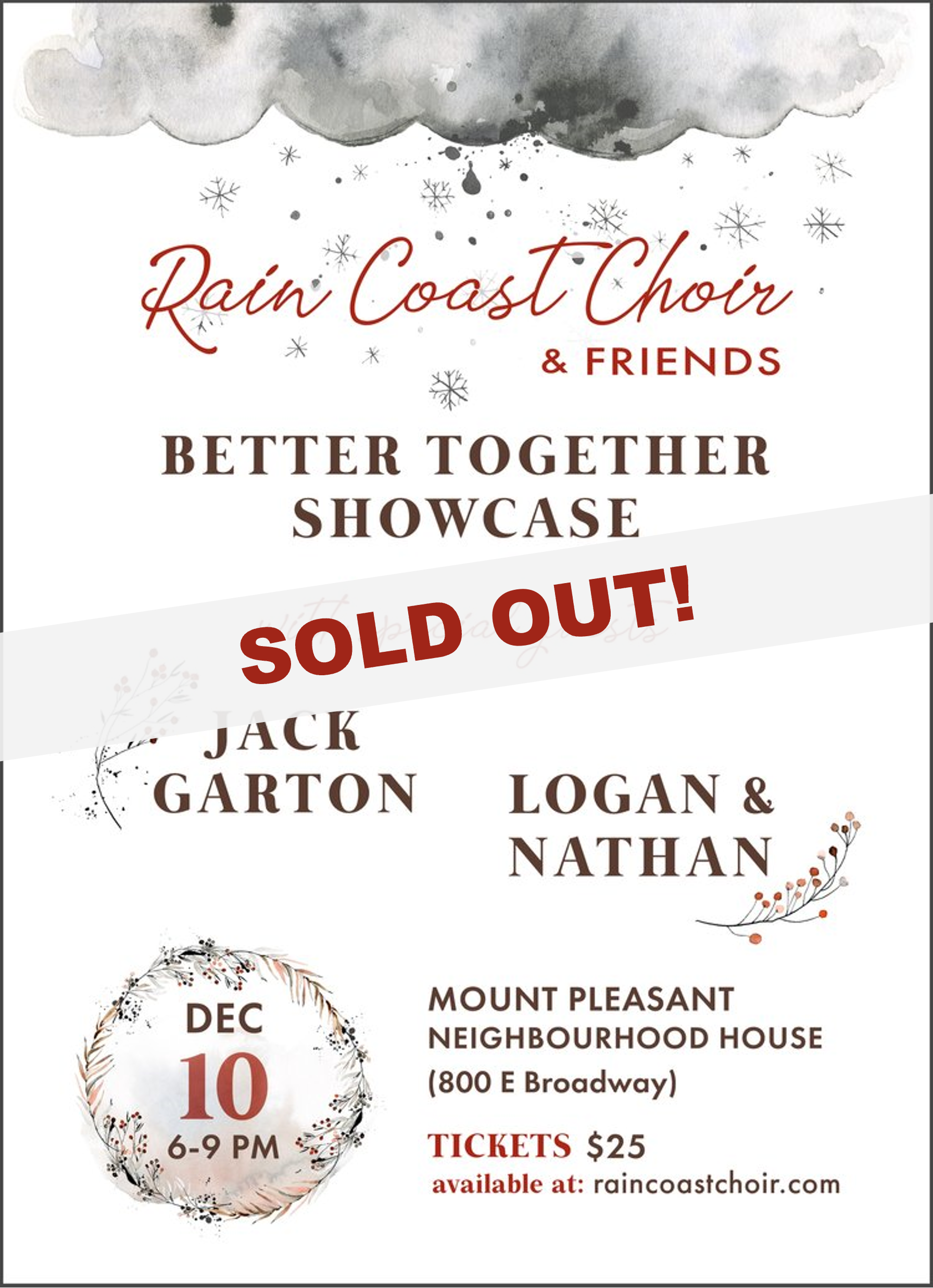 Rain Coast Choir's Better Together Showcase will feature songs by The Beach Boys, Bill Withers, The Cranberries, and more! We are excited to feature special guest appearances by old friends of Rain Coast, Jack Garton, and Logan and Nathan.